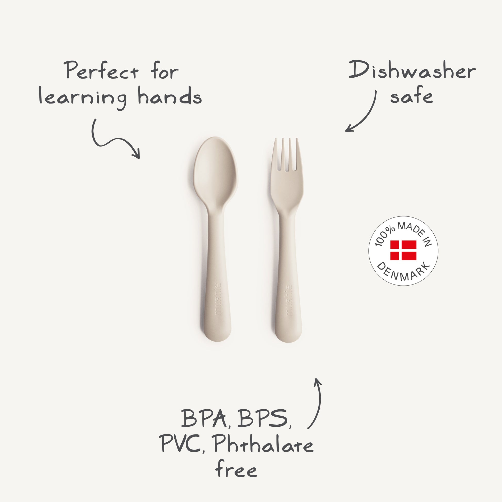 Featuring soft colors and clean design, the Mushie plastic fork and spoon set is simple, thoughtfully crafted, and perfectly sized to encourage your child’s independent feeding skills and boost their confidence at mealtime. Made in Denmark from durable, non-toxic plastic, these forks and spoons are dishwasher-safe and designed to withstand everyday use, helping simplify mealtime and make cleanup quick and easy for busy parents.