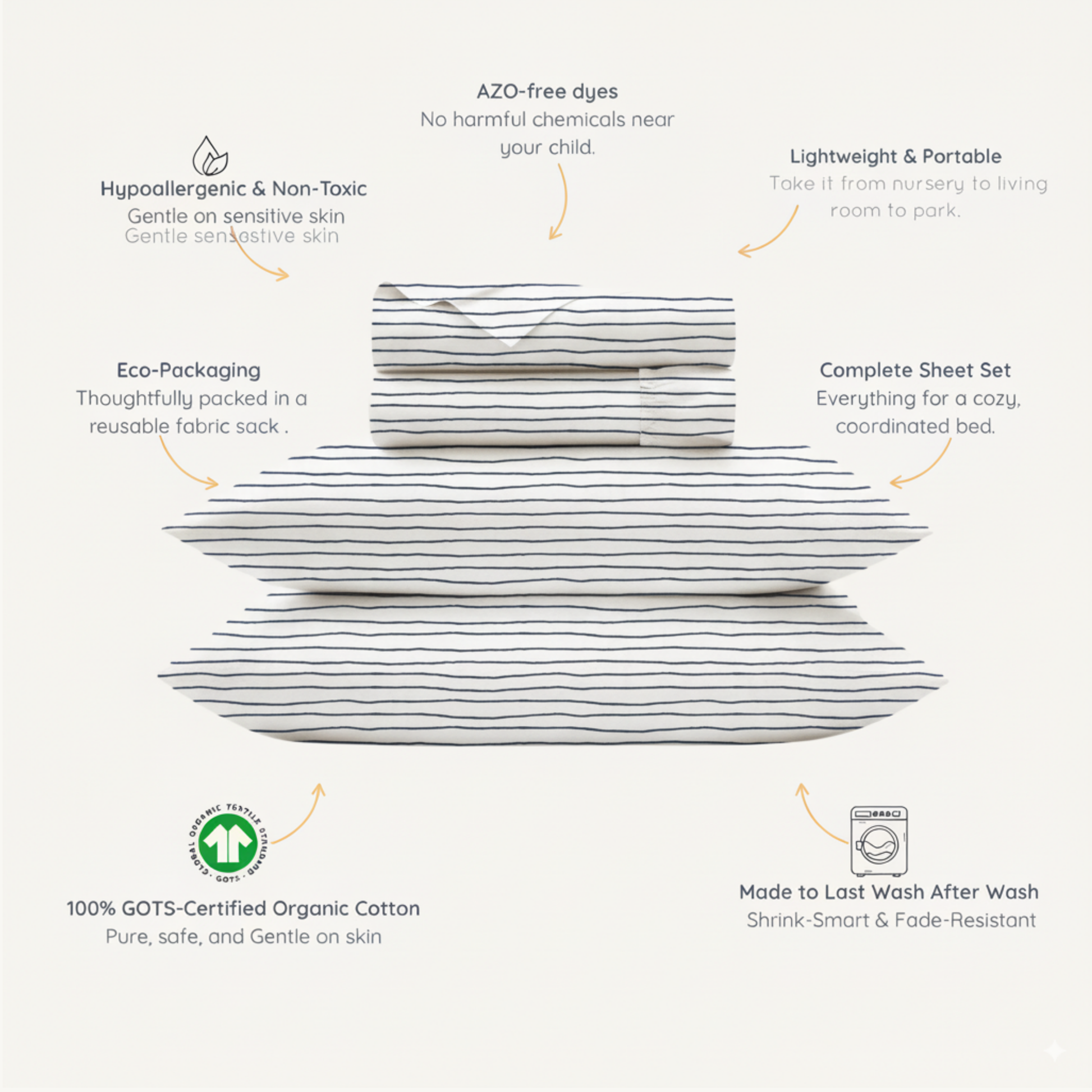 This Midnight Blue-striped sheet set adds classic geometric style to your little one's sleeping space. It is Dreamy Soft & Breathable For Your Child's Comfort Through The Night. Better Still, It is GOTS Certified, Meaning It's Woven From The Purest Materials And Free Of Harmful Chemicals & Toxins.